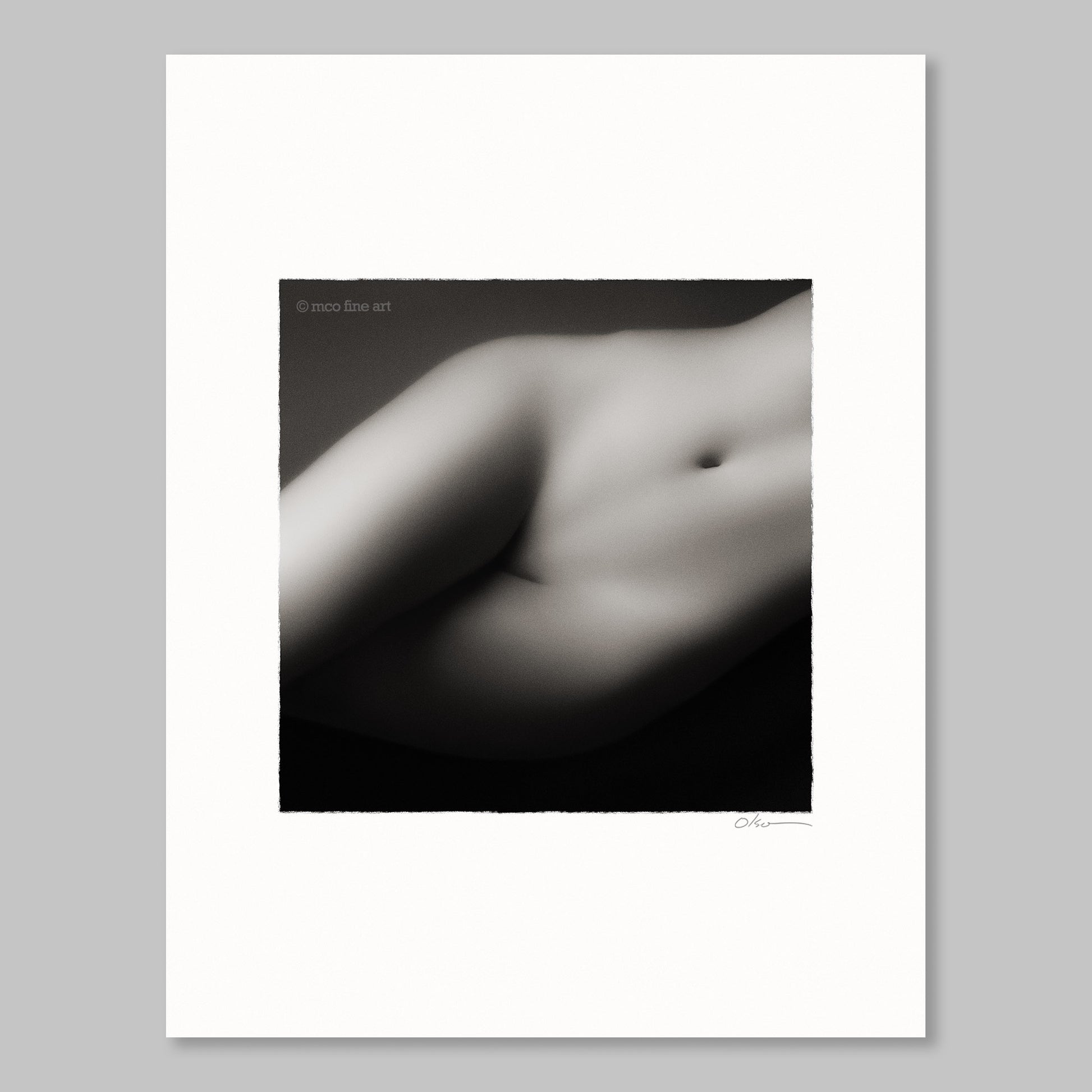 Hips and waist. Silky skin in silky light. Fine art nude composition in square format. Warm monochrome.