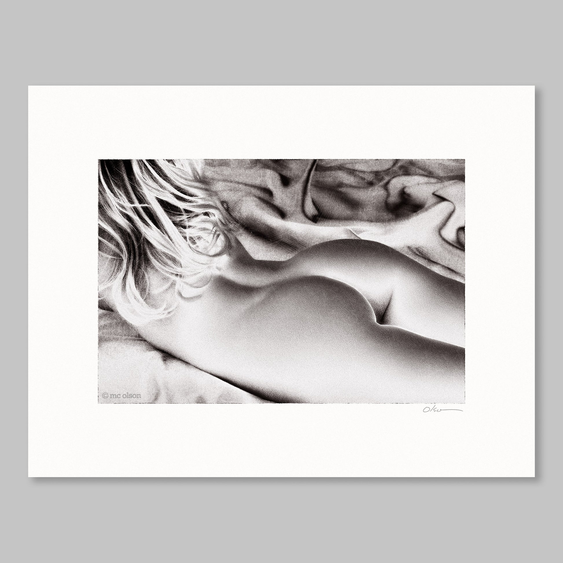 Reclining nude on satin sheet. Monochrome.