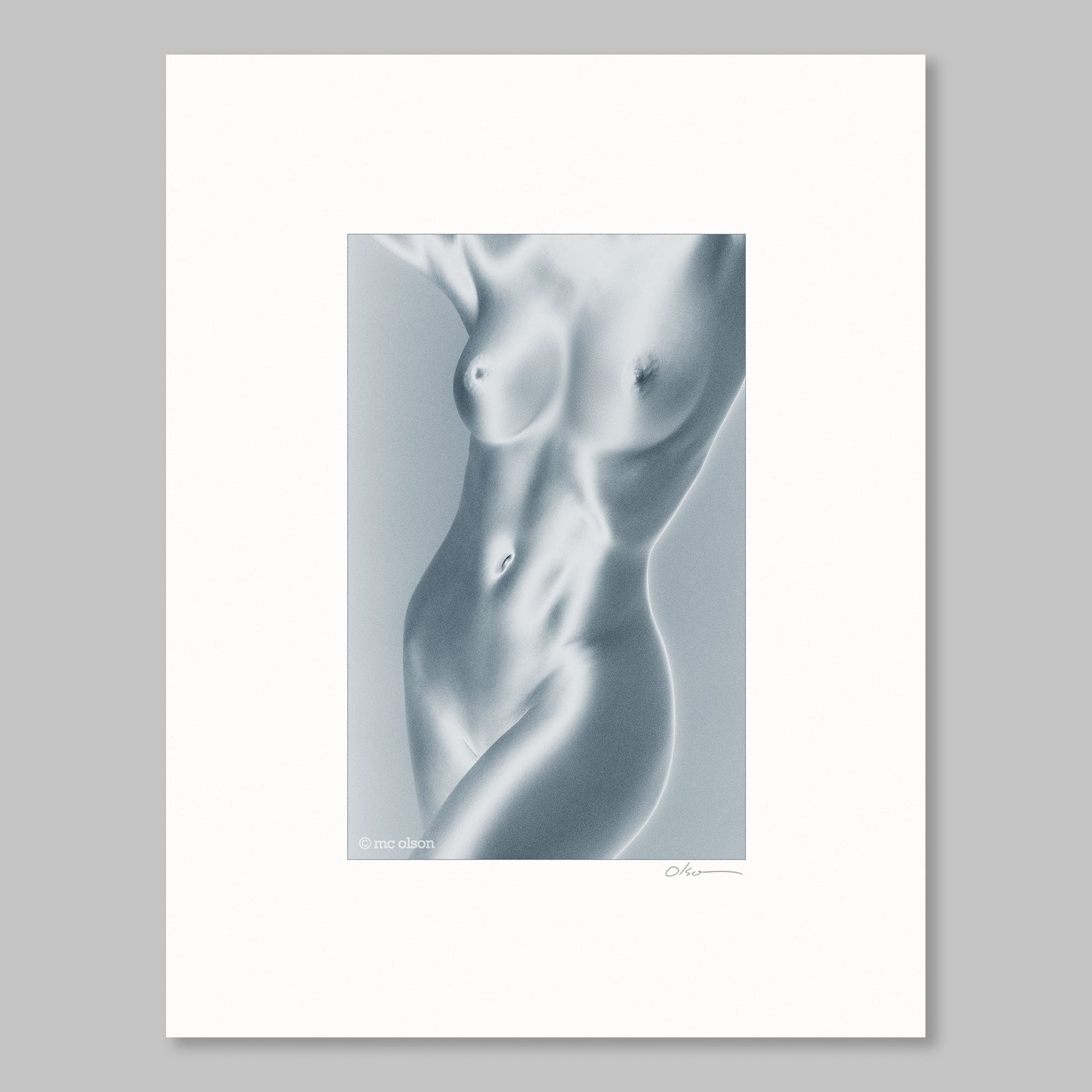 Standing pose nude figure; torso study. Cool monochrome.