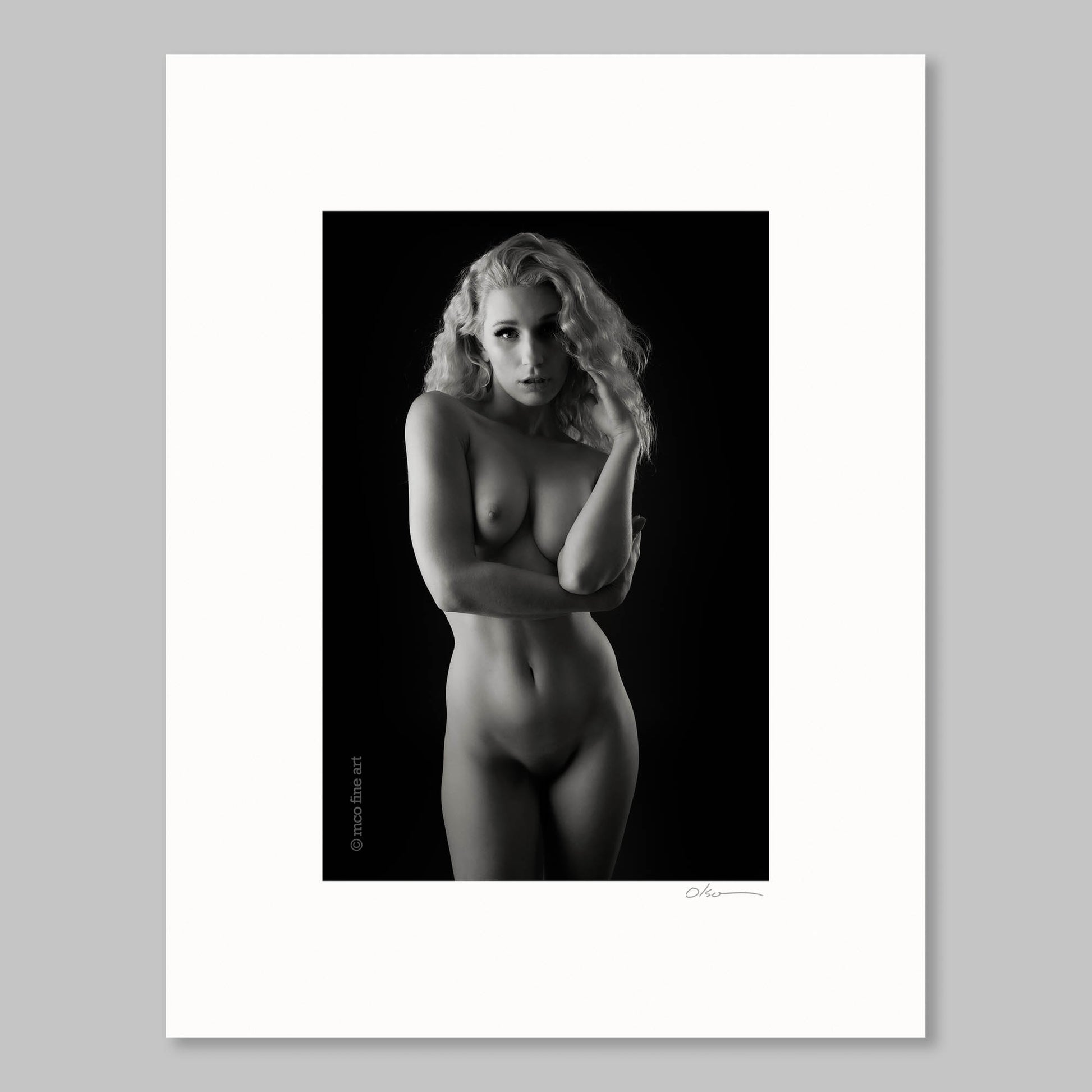 "Hey, call me?" Fine art nude standing pose. Low-key monochrome.