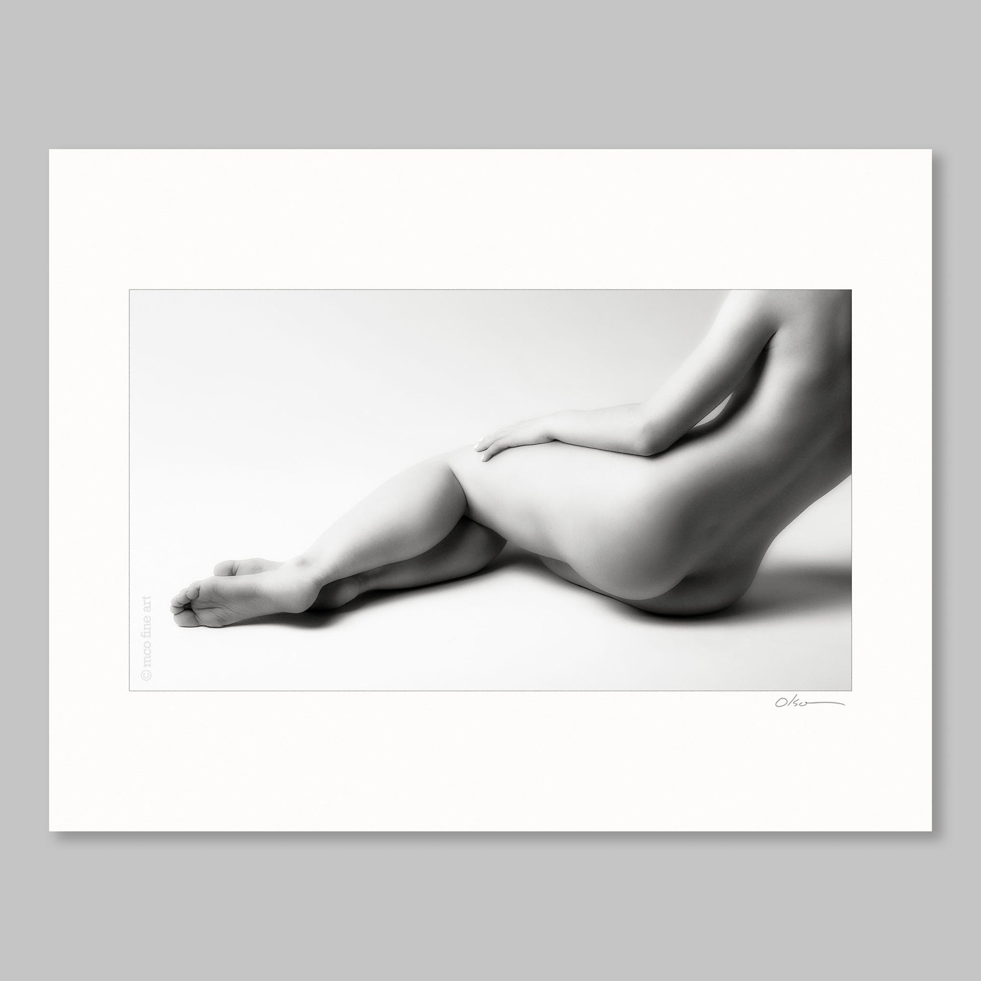 Classic, minimalist, reclining nude composition, legs and butt. Monochrome.