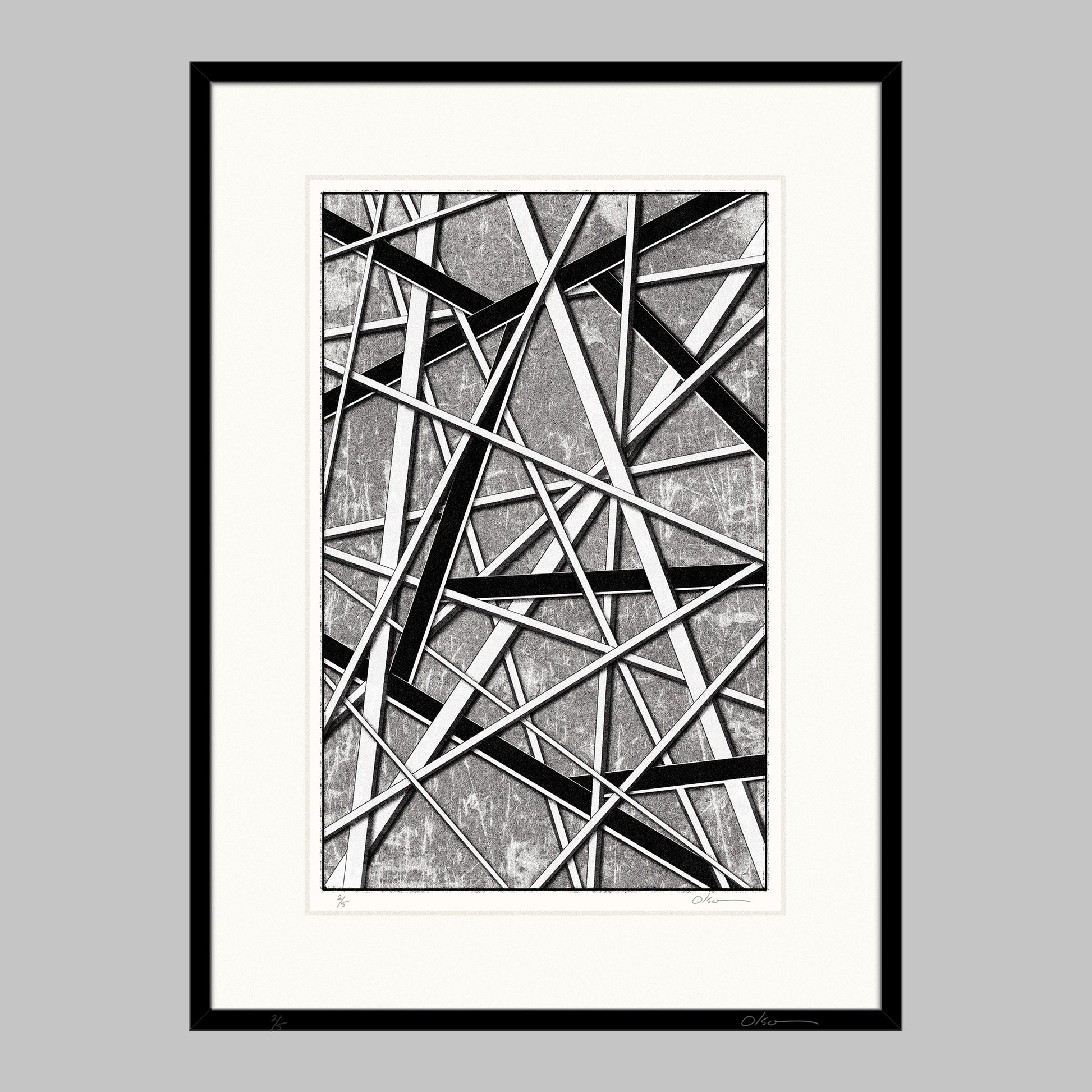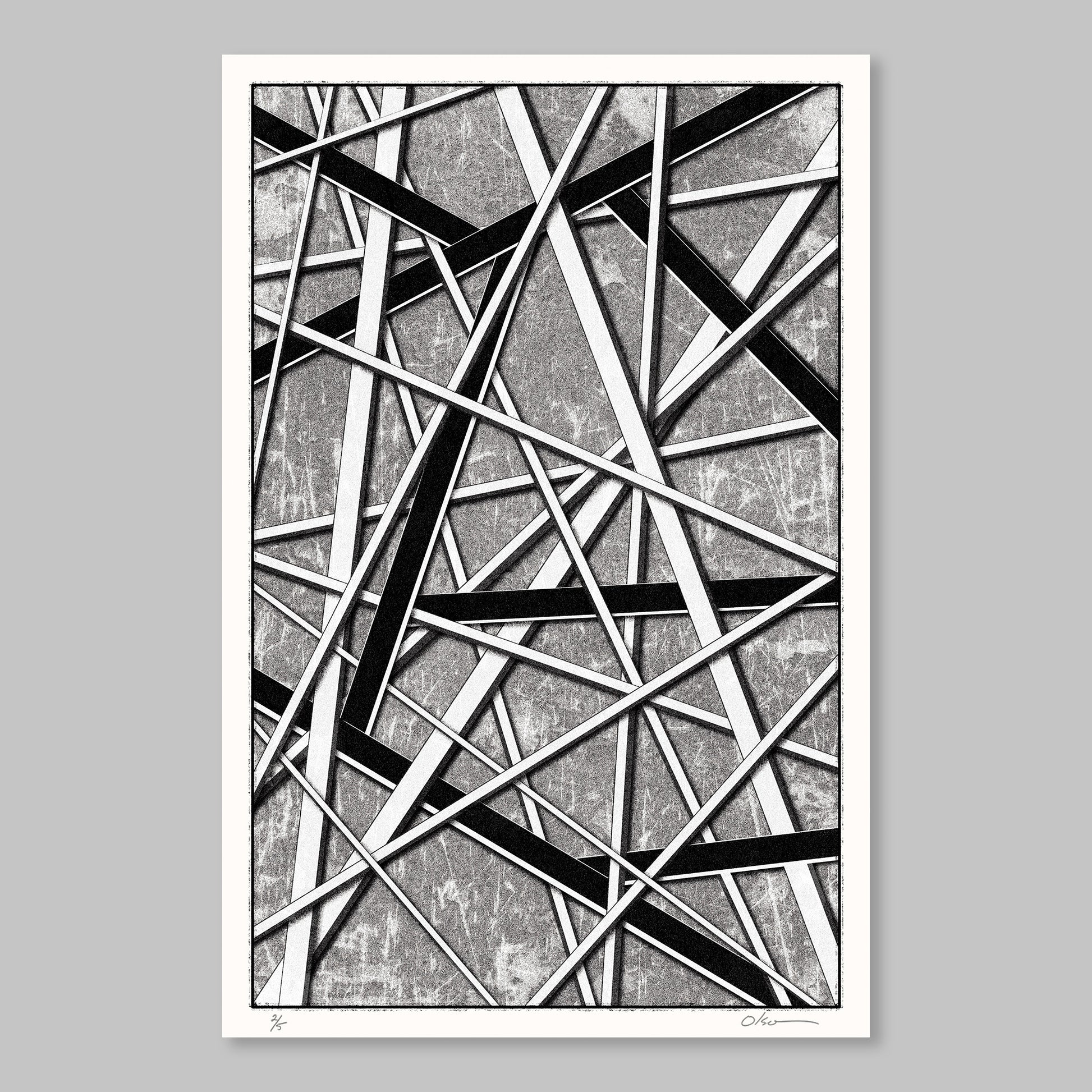 That guitar's dynamic and rogue paint and tape design were inspiration. In photoshop, I added layering of the lines, shadowing, grit, background texture. I omitted elements that referred directly to guitar shapes or parts. In memory of my old friend Mike who died young. RIP, Mike (1966-2021).