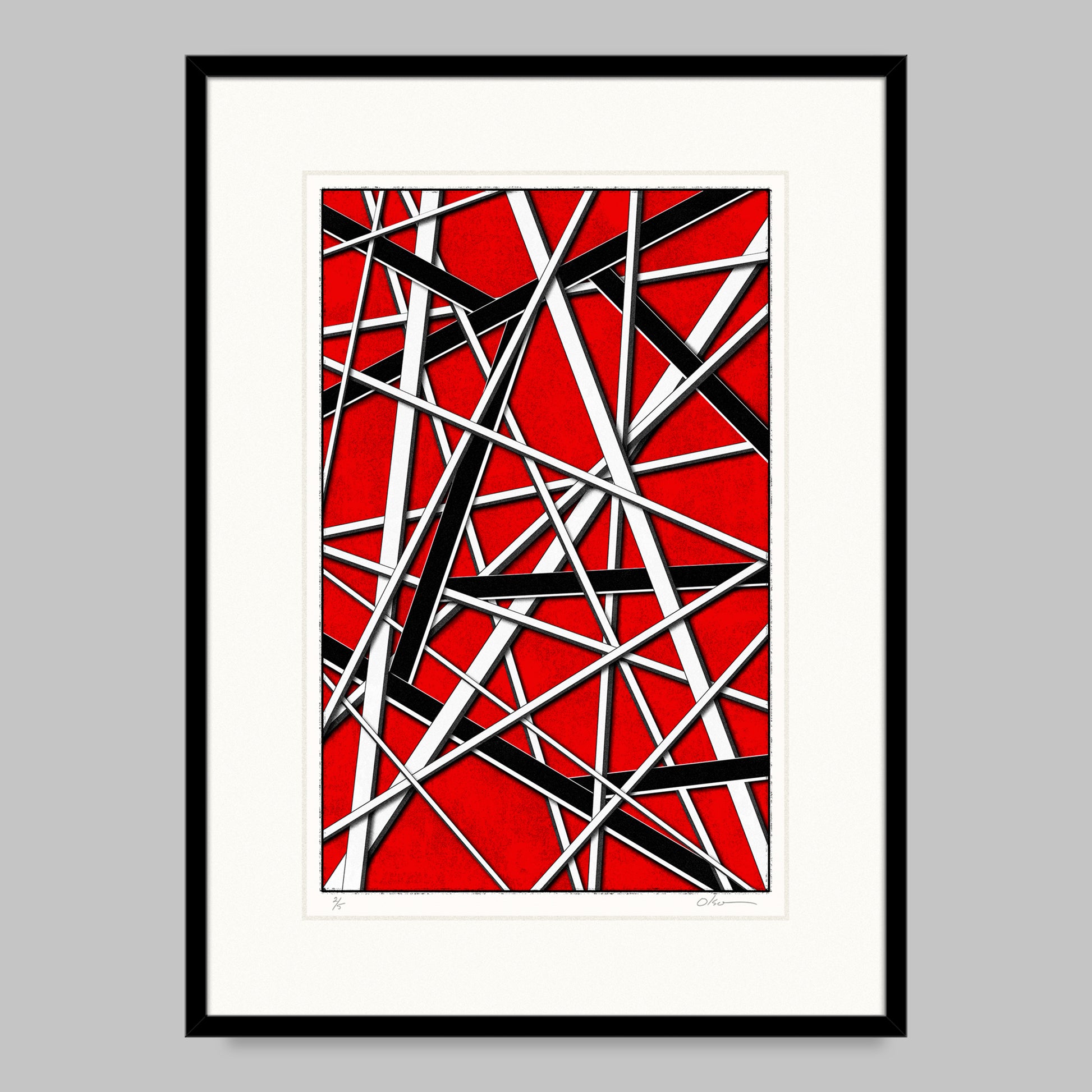 This composition is inspired by a famous electric guitar of the 1980's. The Kramer guitar that Eddie Van Halen customized and became epic. "5150" refers to the guitar, an album, and the band's concert tour in the 1980's. It also refers to California law. I believe the guitar's alternative nickname was "Frankenstein" because Van Halen had modified it extensively, including its jaunty, angular paint and tape job. On the 5150 guitar, Eddie used electrical tape for the black lines.