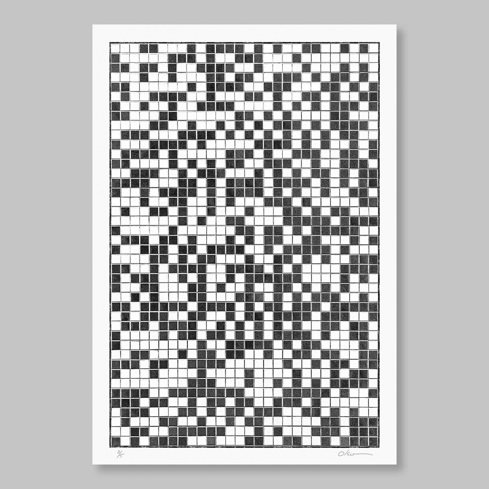The foundation of this abstract composition is a photograph of little gray, reflective tiles on a wall. Because of the metallic, reflectivity of the tiles, small changes in lighting and angle of view changed the patterns and contrast, and I sought a compositional balance. I was thinking about language, communication, neighborhoods, equality, individuality, and social groups when working on this. No kidding! #1 is black and white, and #2 red and white. Camera: Fujifilm X-20.