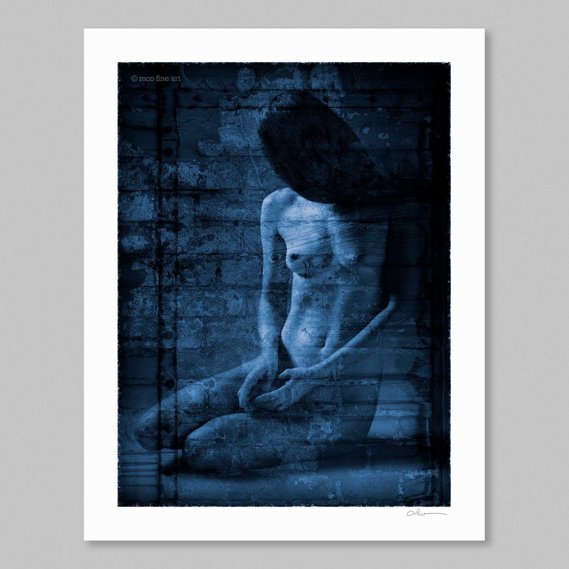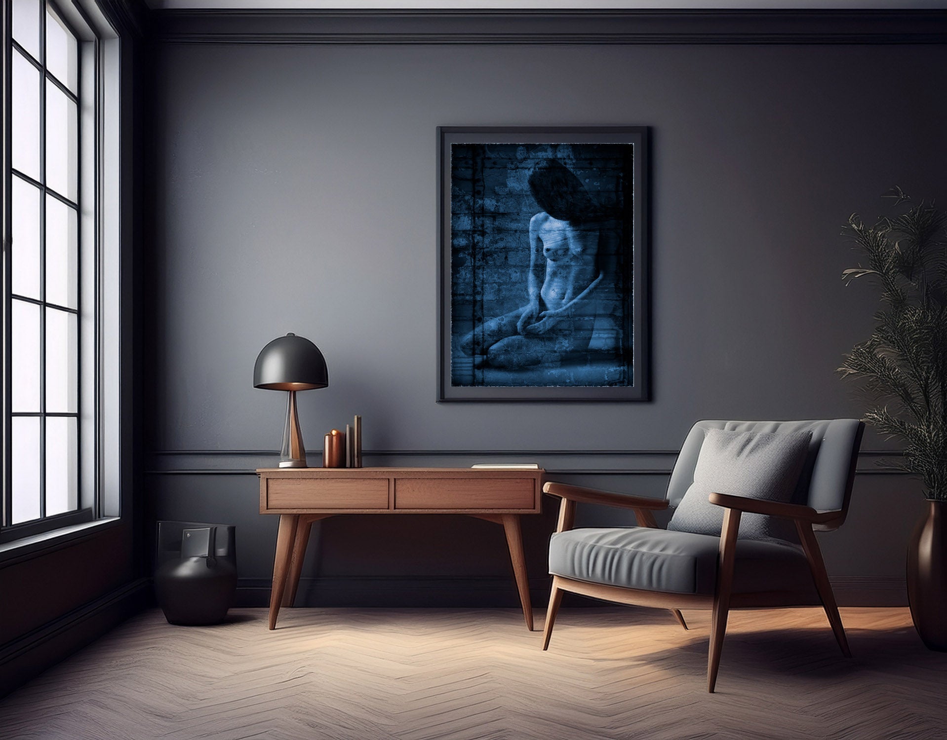 Behind borrowed walls, desires hymned in silence. A composite composition with model, Anna, in a reserved, introspective seated pose. Blue monochrome.