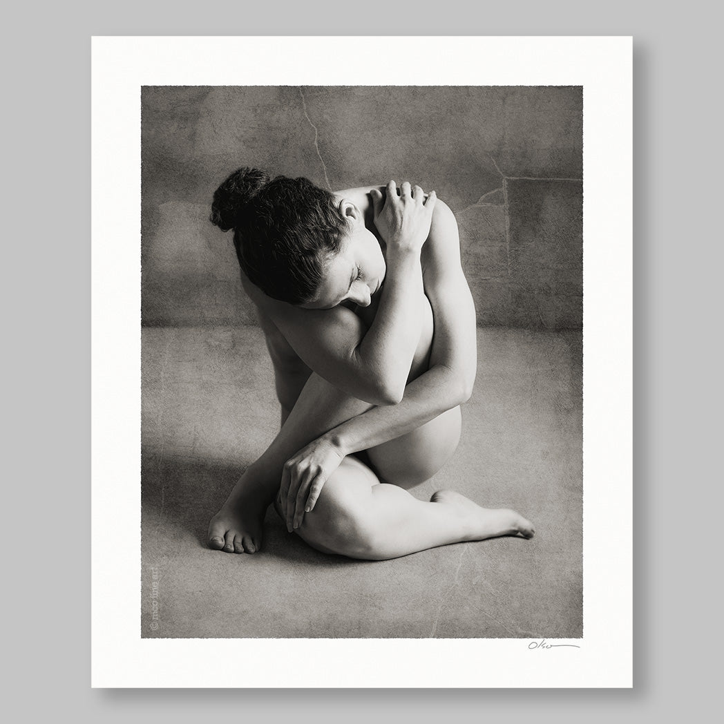 Rendered in soft natural light and warm sepia, Contours of Solitude evokes quiet introspection, blending vulnerability with strength in a moment of meditative stillness. This photograph emphasizes textures: the gentle grain of the skin, the soft falloff of natural light across the body, and the subtly distressed edges of the print, all reinforcing the feeling of introspection. It is both vulnerable and self-contained — a private moment captured with reverent restraint. Part of an evolving series exploring the human figure through monochromatic palettes.