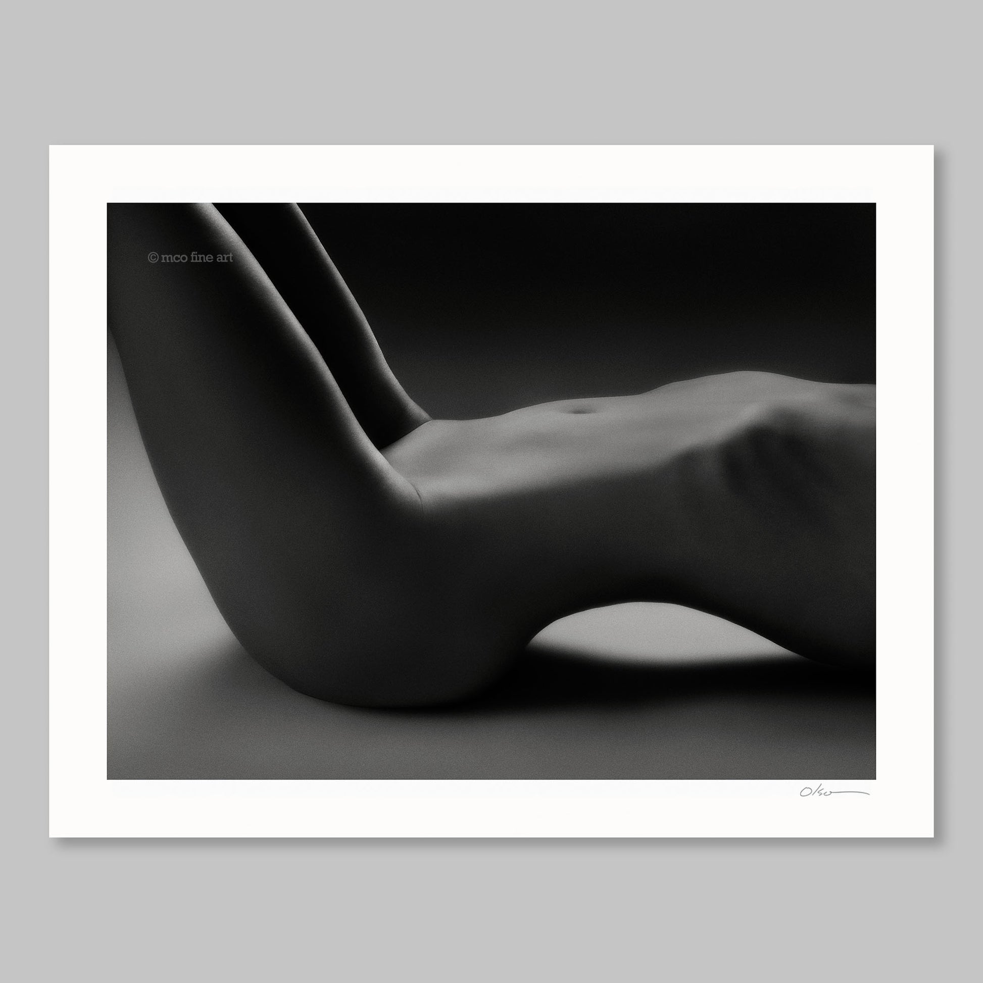 This monochromatic composition transforms the human form into a study of pure sculptural beauty, where dramatic chiaroscuro lighting models gentle curves into an almost topographical landscape. Olson's framing and rich black-and-white treatment abstract the figure beyond literal representation, creating flowing gradations from highlight to shadow that reveal the essential geometric poetry of human anatomy. The result is both intimate and universal—a meditation on form that elevates the body into pure aesthetic phenomenon within the classical tradition of fine art figure study.