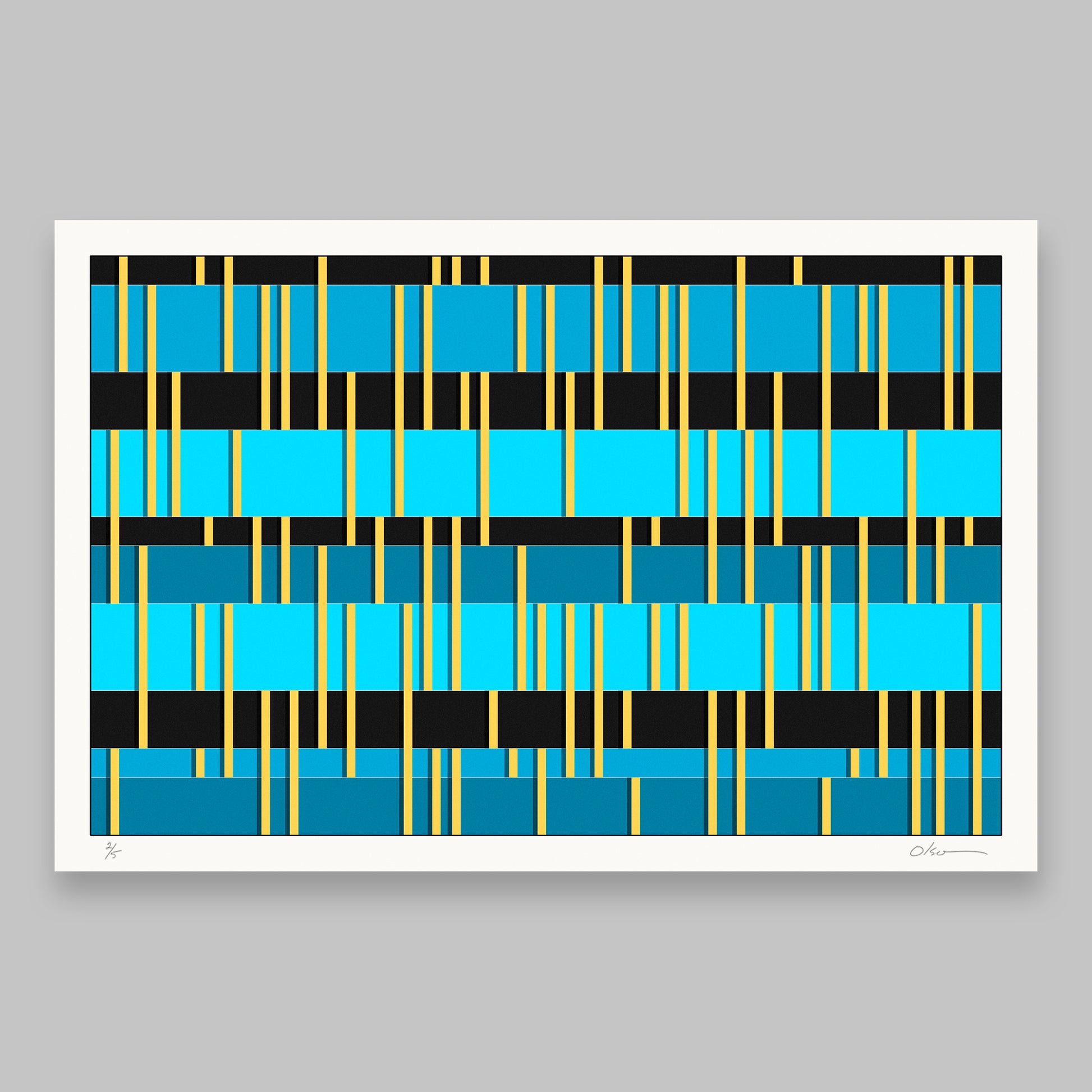 This composition or design is inspired by the patterns, lines, and shapes on the Arbor Gate Development building at 2501 West Beltline Highway, Madison, Wisconsin. Shades of cyan-blue, yellow, and black.