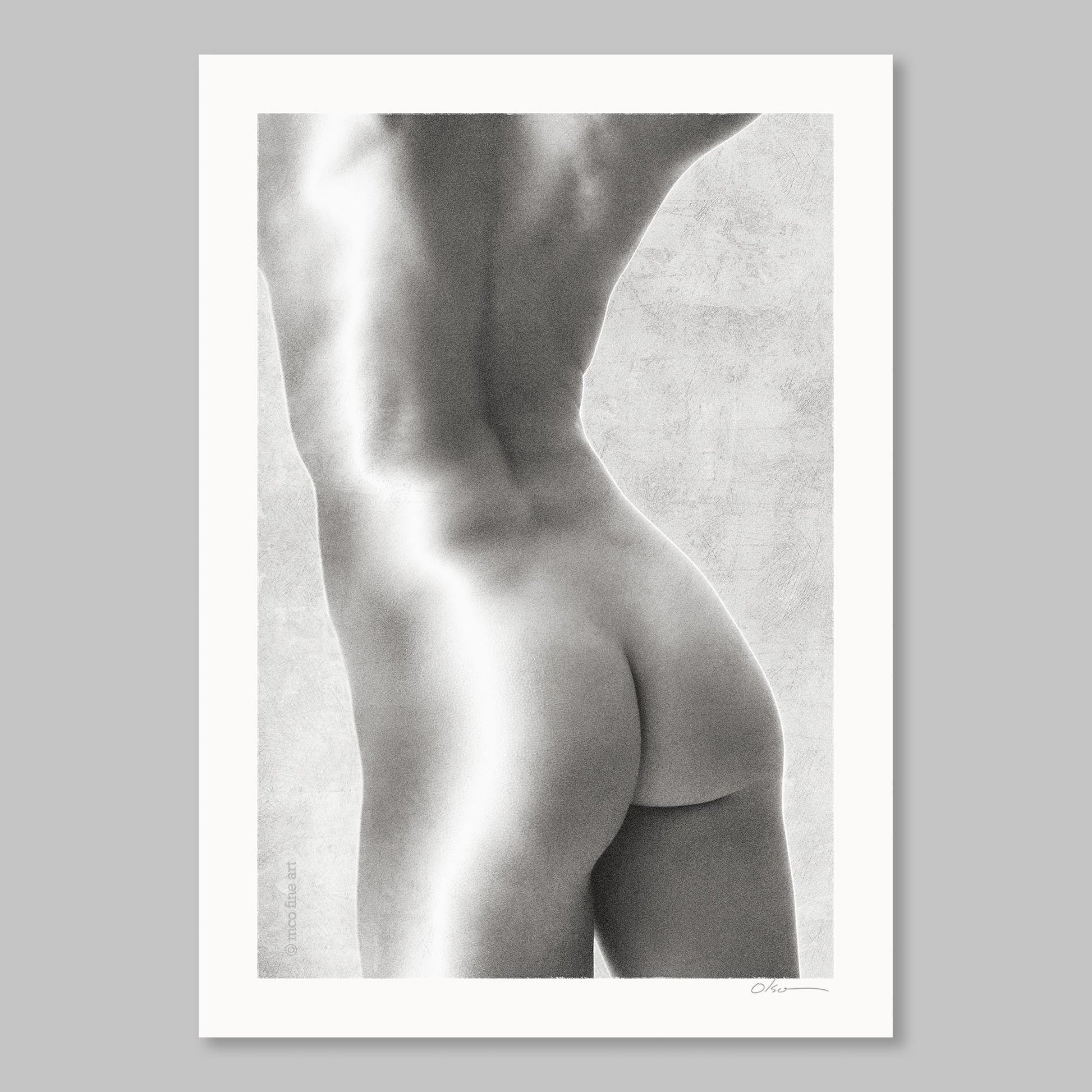 Rendered in luminous monochrome, this composition distills the human form to its purest lines and tonal relationships. A vertical stream of light cascades along her side, carving a path between shadow and illumination—revealing the sculptural grace of the figure’s back and hip. The grain-textured surface evokes the tactile richness of traditional film photography, while the muted background recedes into quiet abstraction. With a restrained palette and intimate framing, the work invites contemplation of the body not as portrait, but as landscape—an interplay of curves, planes, and light’s fleeting touch.