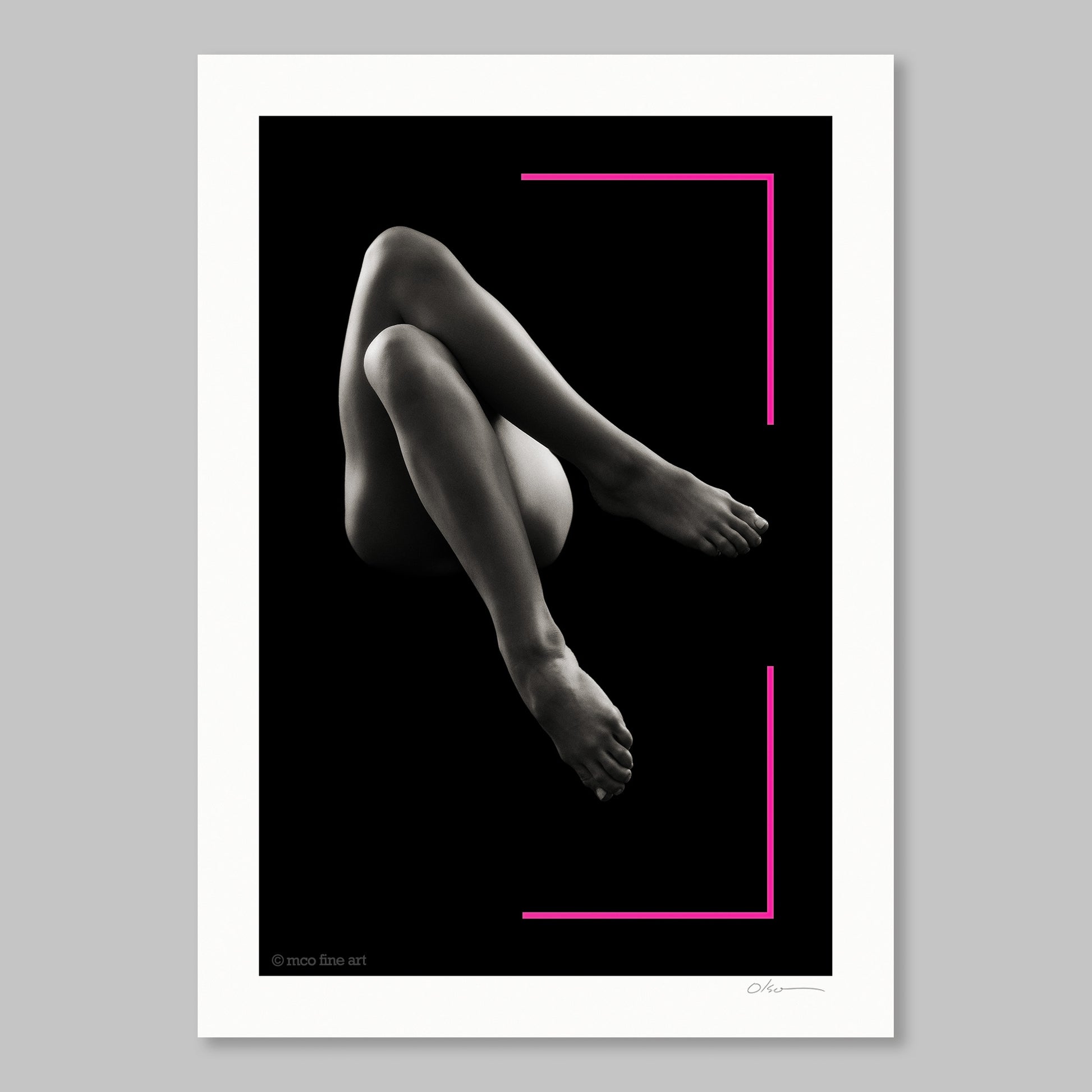 Fine art nude composition. Legs crossed, suspended in the dark. Monochrome with bright pink.