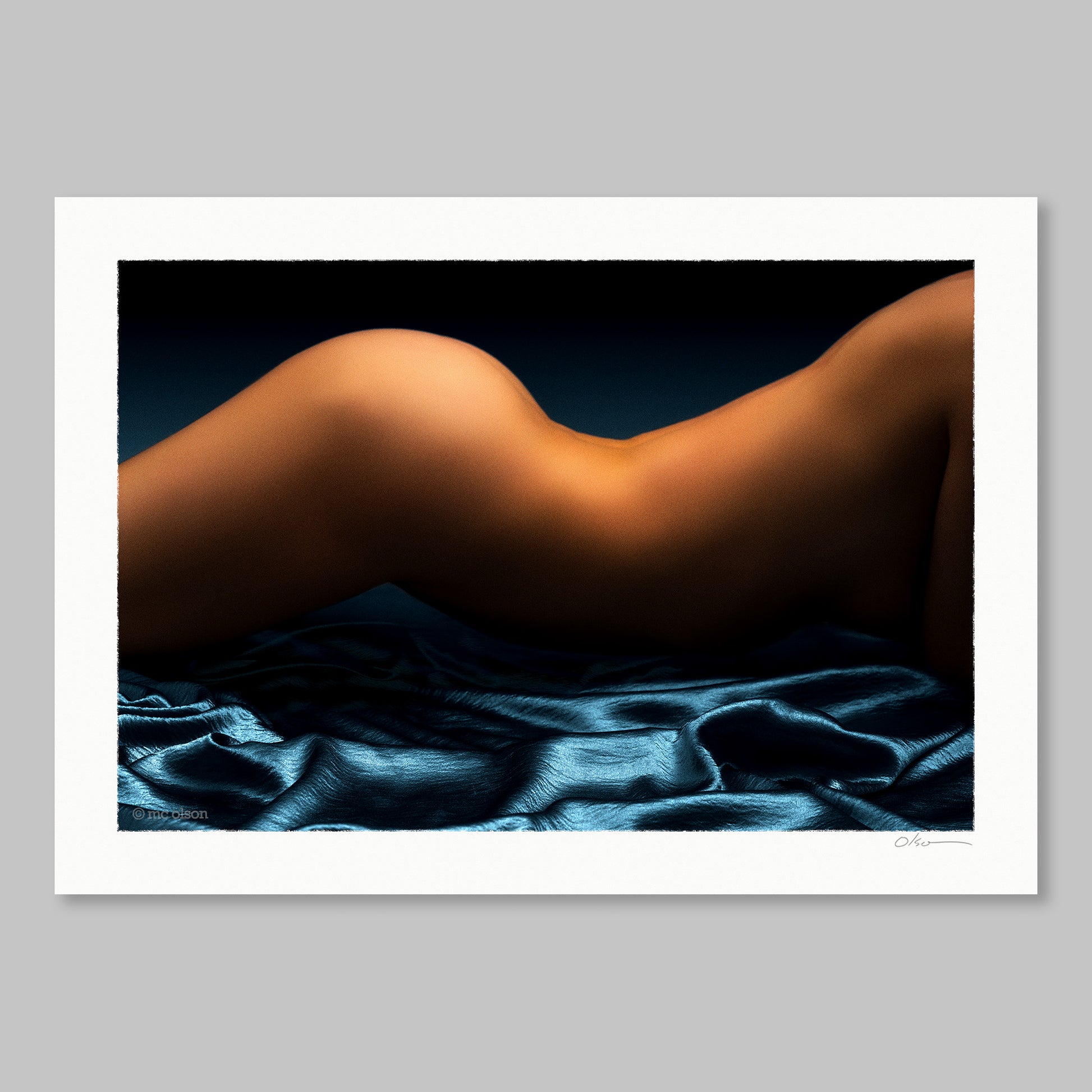 Fine art nude bodyscape. Smooth curves and warm flesh tones over undulating blue satin. Original color print on natural cotton paper.