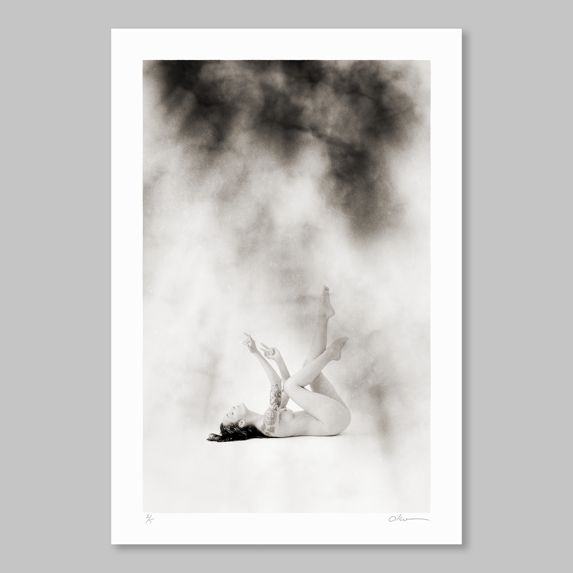 This is a warm tone monochromatic print. It is a composite of three image layers (obviously, she was not actually floating in or falling through the sky).