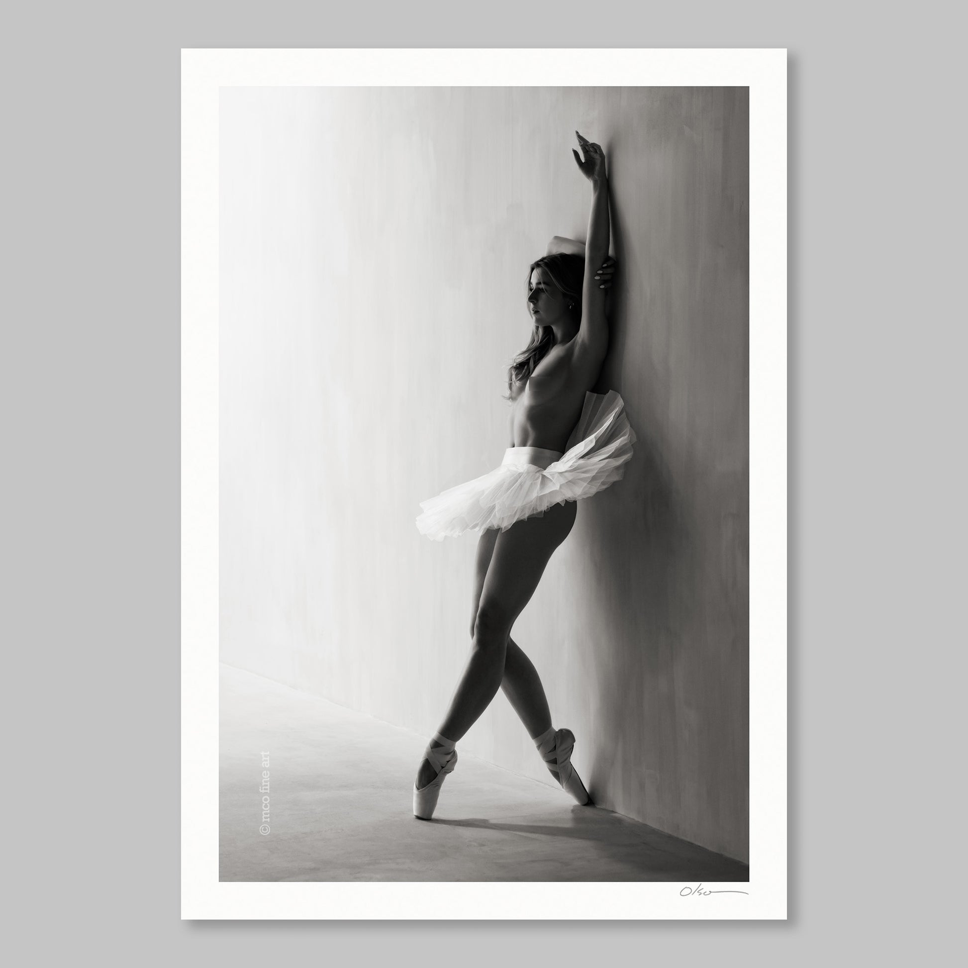 This monochromatic piece fuses the elegance of ballet with the intimacy of fine art nude photography. The dancer, poised en pointe against a pale wall, stretches into a moment of suspended grace. Light softens across her form, illuminating both the delicacy of tulle and the strength of her relaxed pose. At once restrained and expressive, the composition captures the timeless dialogue between discipline and freedom.