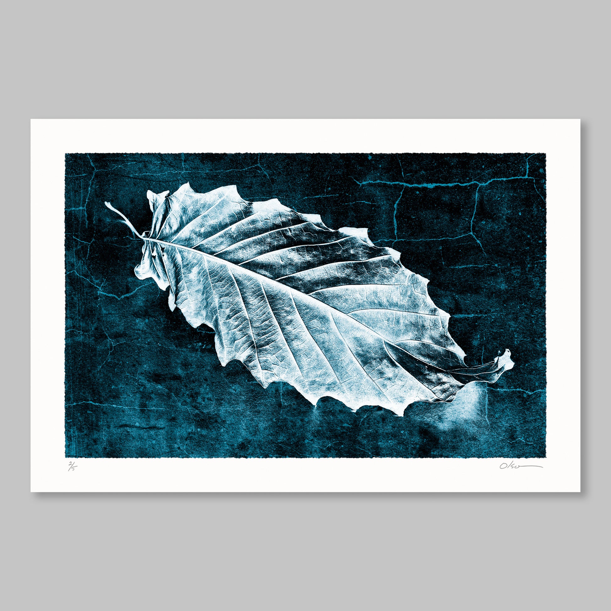 This is a monochromatic print with cyan/blue tonality, rich darks, bright highlights, and a grainy texture. Equipment: Fujifilm X-E3, Fujifilm 50mm lens, tripod.