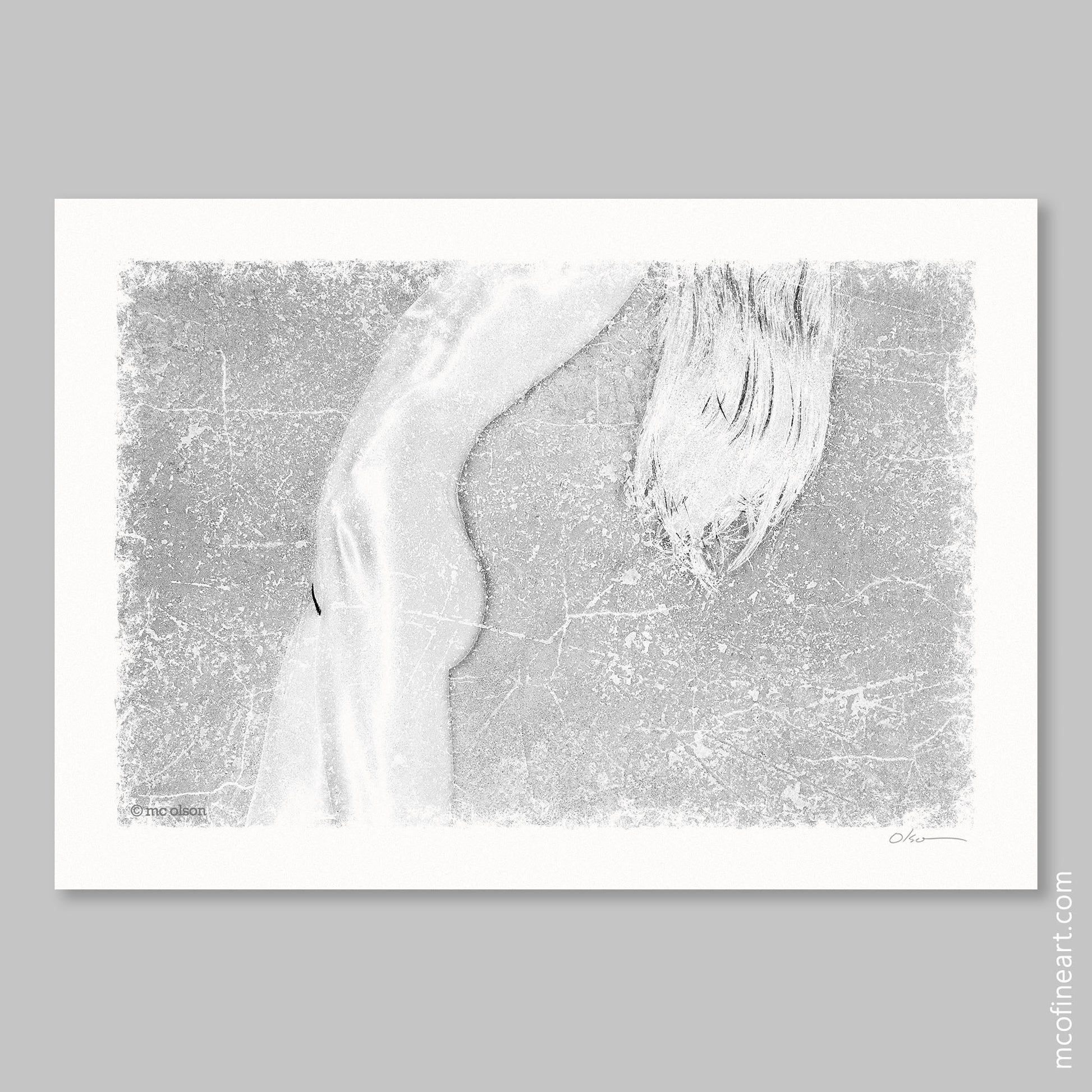 Nude figure. Gritty. Slightly warm tonality. This is a minimalist and somewhat abstract composition, built on, perhaps, the 'S' curve created by her back and rump. A painter's technique is to highlight a focal point or center of interest with the brightest value. In this composition, the reverse is attempted.