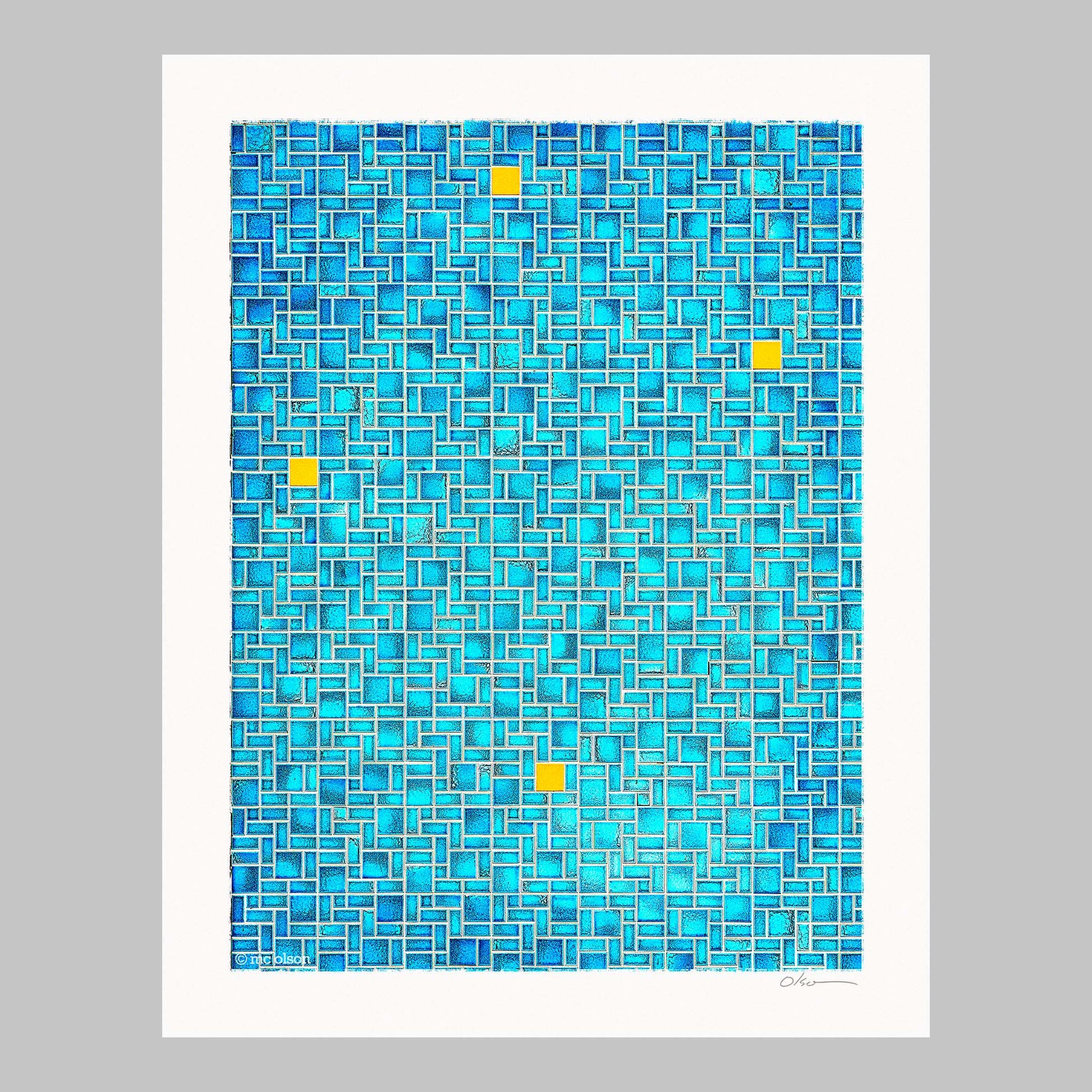 Geometric abstract art in blue and gold. The original tile work is on the outside of a building on Monroe Street in Madison, Wisconsin. There are three similar sections, weathered and worn, and each is about 3 feet by 5 feet. Curiously, each of the sections of predominantly blue tiles has just a few randomly placed yellow square tiles. This couldn't properly be called cubist art, but maybe cubical? It reminds me of my griddy compositions, and one in particular titled Aerial Boundaries. I cannot take the credit for the composition here (the randomly placed yellow tiles) but perhaps for the inspiration to capture it and produce an interpreted expression of it, before it is weathered away or torn down.