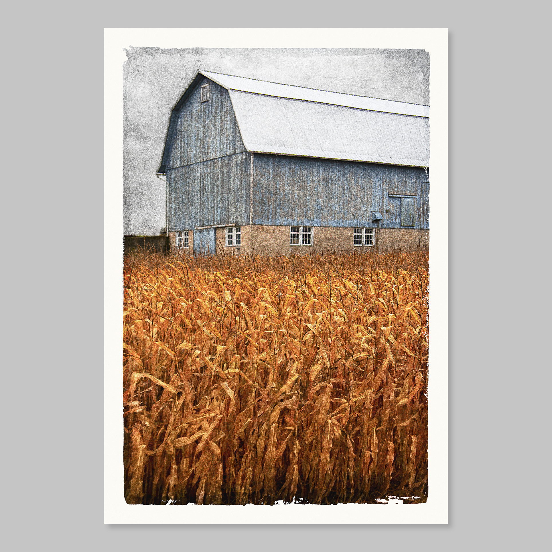 I bring my camera with me on most errands and road trips. Sometimes, photography is the primary motivation for a drive. I captured October Barn on a cool, drizzly autumn day in Jefferson County, Wisconsin. The barn's unique, pale-blue, weathered paint grabbed my attention, as did the highly textured, soon-to-be-harvested, golden corn. I'm really fond of Wisconsin corn fields in autumn for some reason. October brings the best skies.
