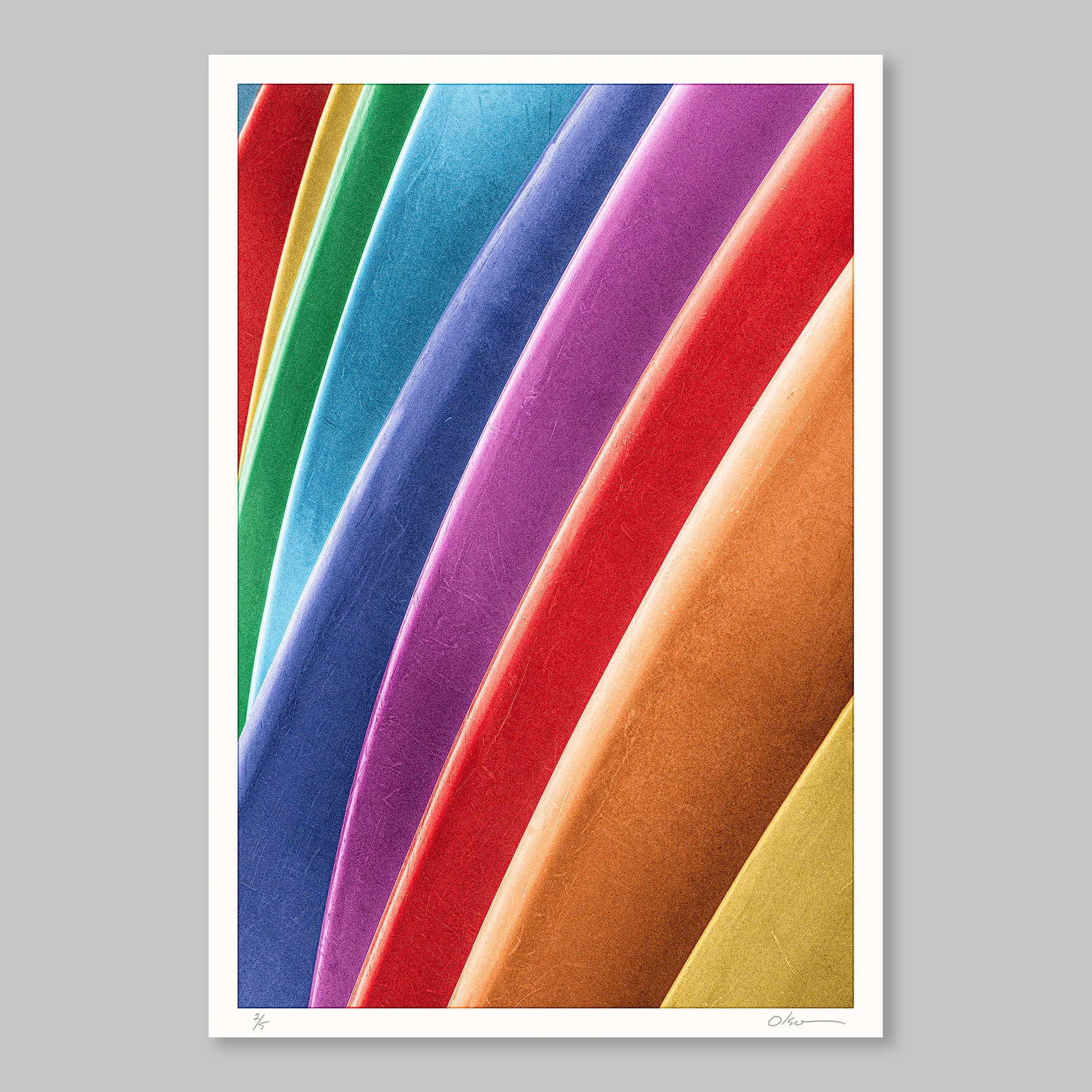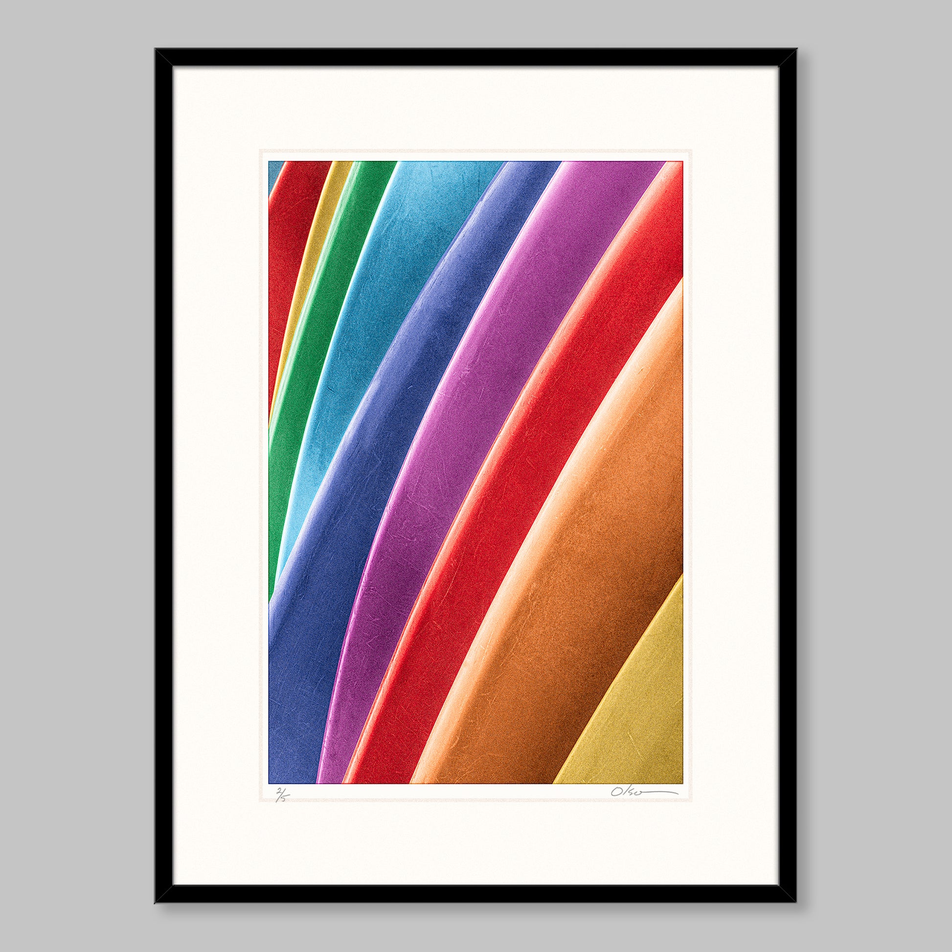 Morning sun glinted off rows of overturned boats (plastic kayaks) in Monona Bay's Brittingham park in Madison, Wisconsin. I captured the image in black and white and painted in the rainbow hues by hand, using a Wacom tablet and stylus. Dynamic and colorful, it is one of my favorites. It's not a great picture of boats. Rather, it is an abstract composition built on the irregular repetition of the curved keels -- and the rainbow of colors, of course. Texture in the scathed hulls, in addition to granularity, adds depth and interest.