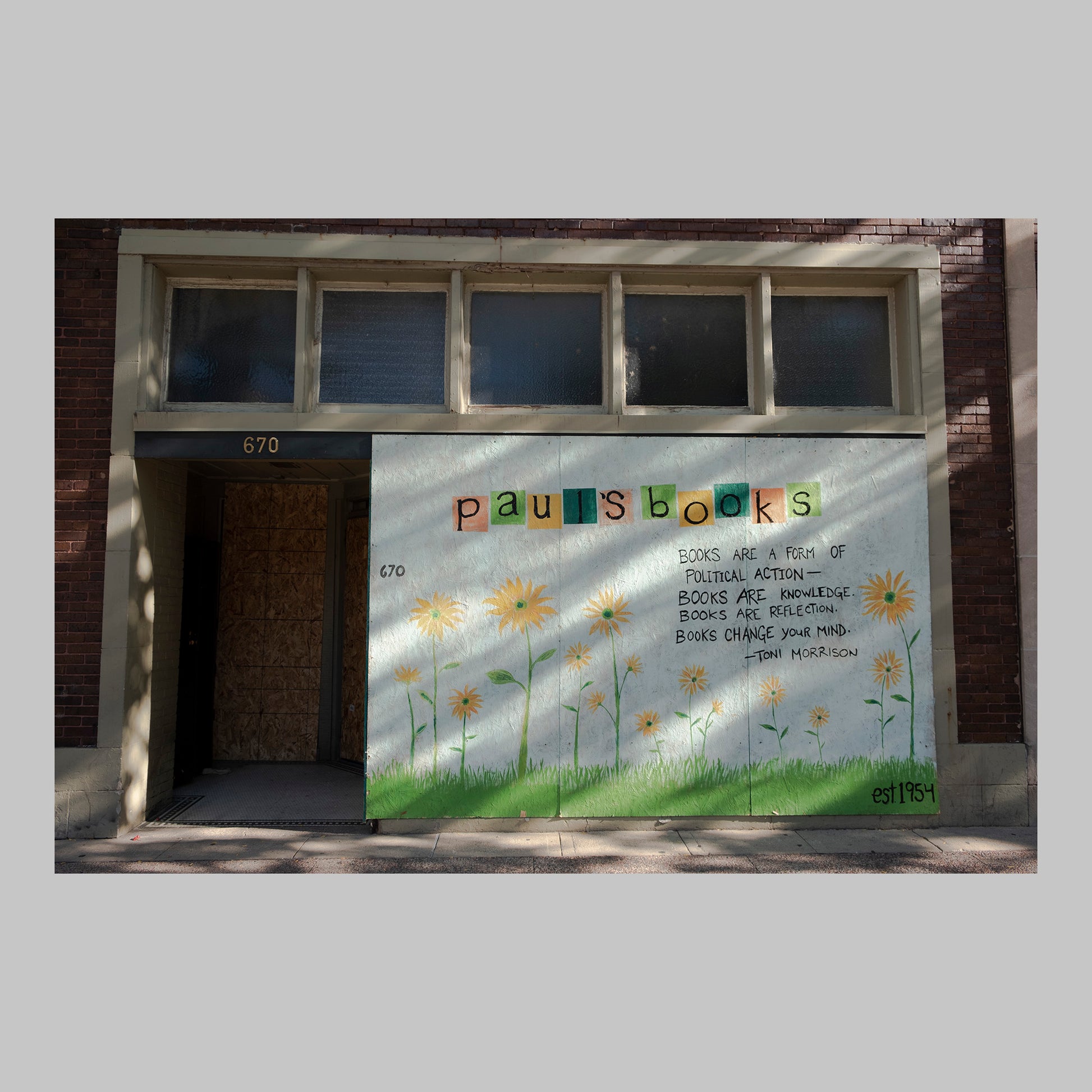 In Madison, Wisconsin, many storefronts were boarded during the height of the Black Lives Matter energy and other political riots in 2020. Many shops on State Street, including Paul's Books, turned their plywood and particle board into works of art. This original work spans 3 sheets of 4x8 plywood. Early morning light created dramatic textures in the particle board. Afternoon light, trees cast shadows. Rain created dark patches. I made an effort to capture a shot with even lighting and did slight editing in Photoshop and removed seams between boards. I captured a picture and made a nice print, but credit goes to the painter/s at Paul's Books for the original concept, execution, and installation.