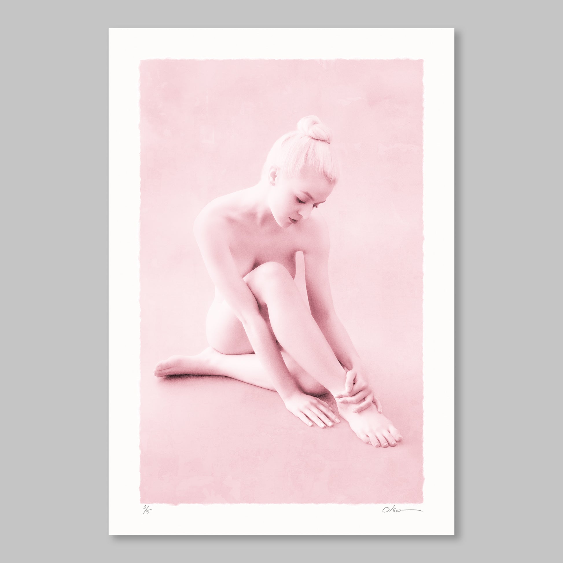Pushing monochrome into pinkness. Great pose. Loved working with this gracious and graceful ballerina in the studio! High key tonality, mottled background, and soft, present grain for ambience.