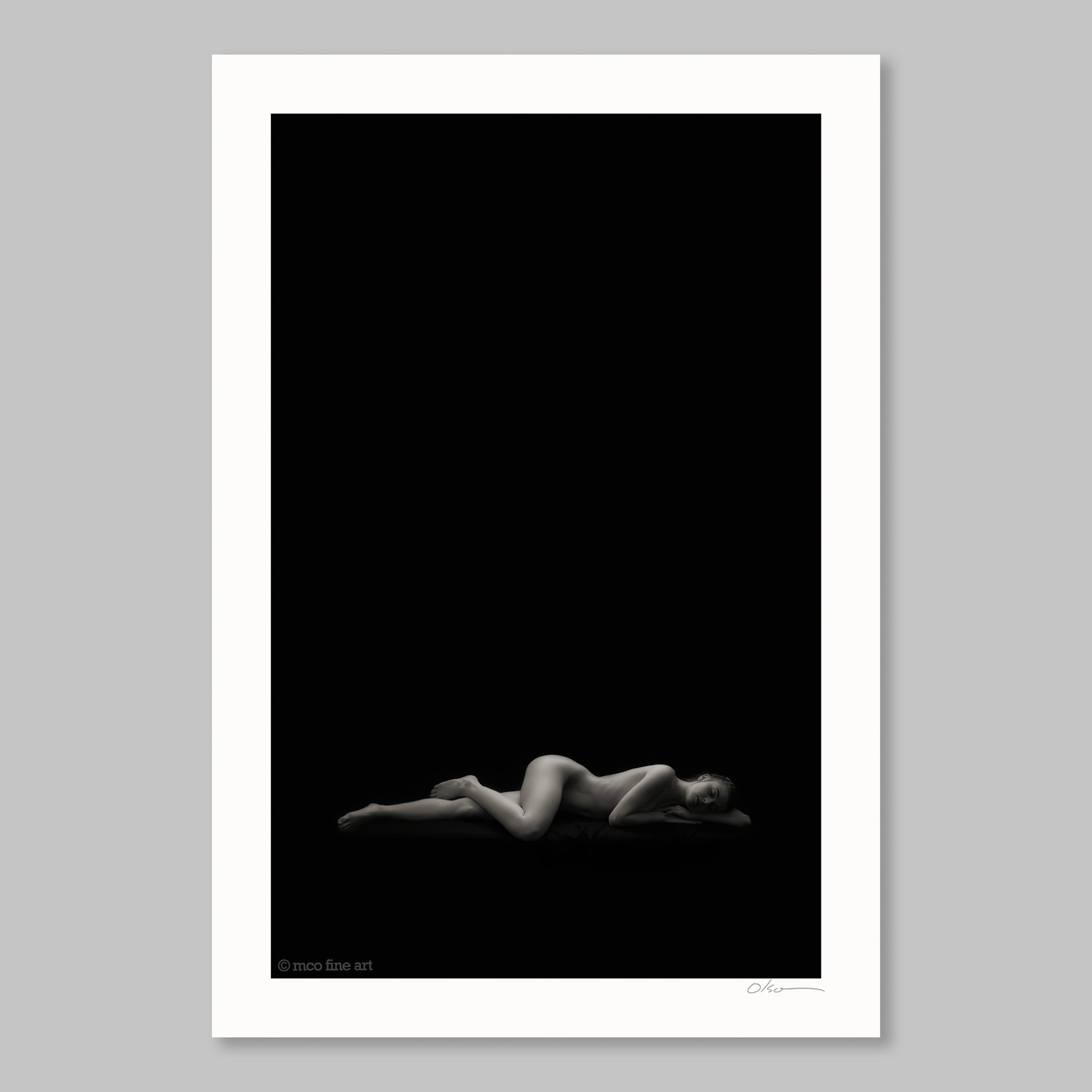 Curvaceous fine art reclining nude in low key monochrome. Quietly sensual.