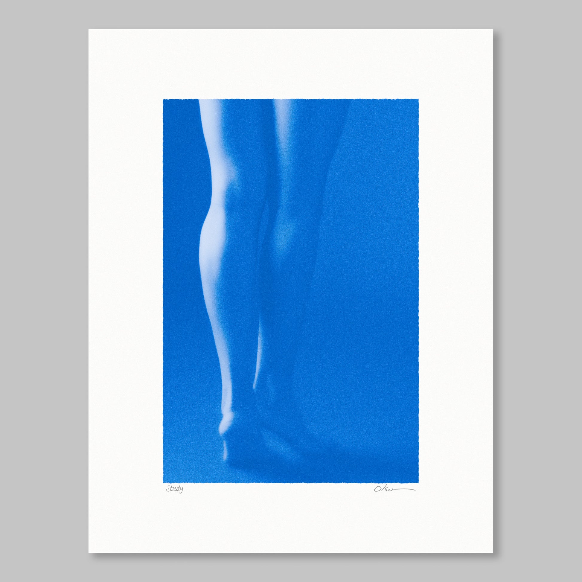 This figure study is brightly monochromatic blue, It's minute grain texture is reminiscent of film or aquatint. The model's feet drift dreamily out of focus. Model: Camille