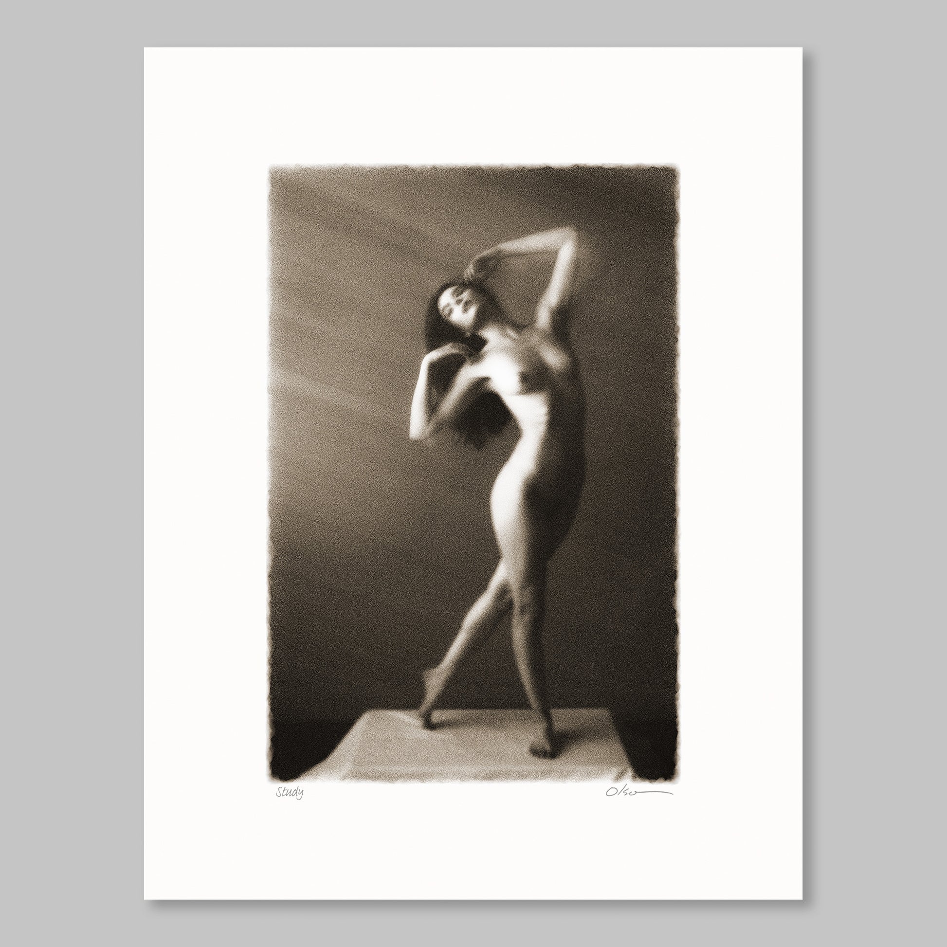 Expressive, statuesque standing nude figure study in warm monochrome. Captured in natural light with handheld slow shutter and intentional, though subtle, motion blur. Soft edge. Light grain.