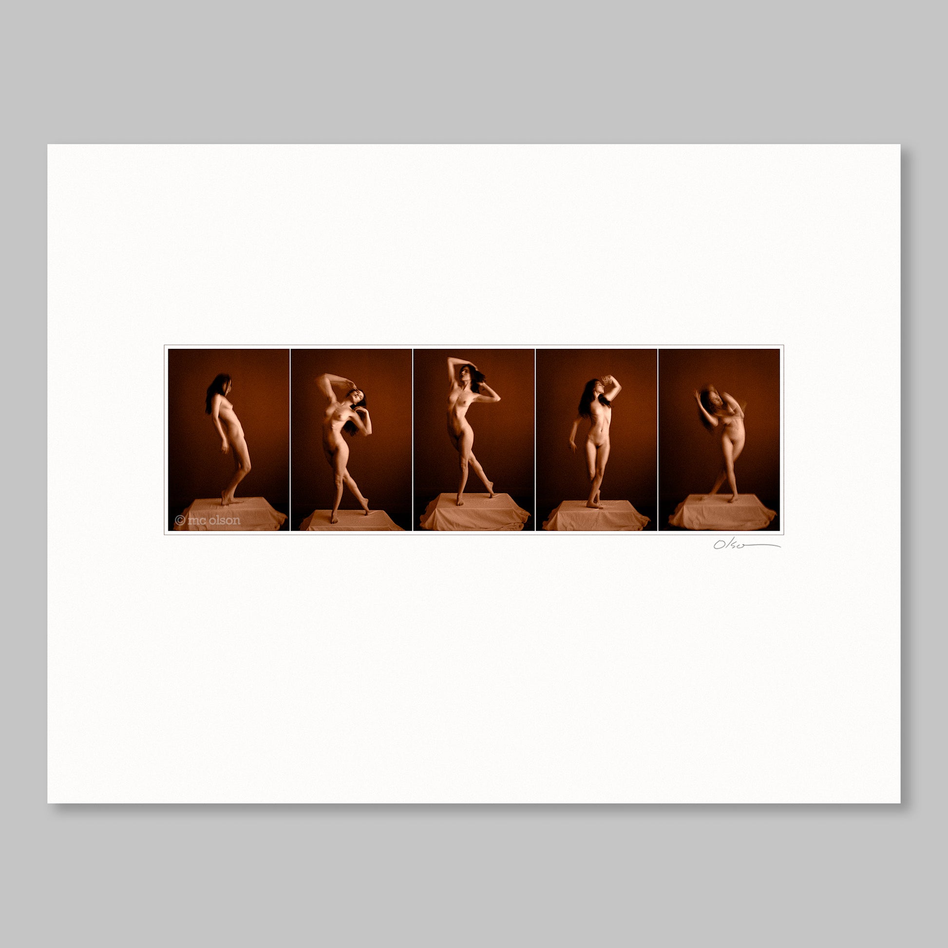 A series of frames captured with a slow shutter speed while the model moved through poses in natural light. I first used this sequence of images as a website banner. It makes a superb print, too. Image size is about 2.5 inches by 8 inches. Presented thus, it's probably influenced, on some level, by Muybridge's groundbreaking and influential work. A thin line borders the series, a complementary detail.