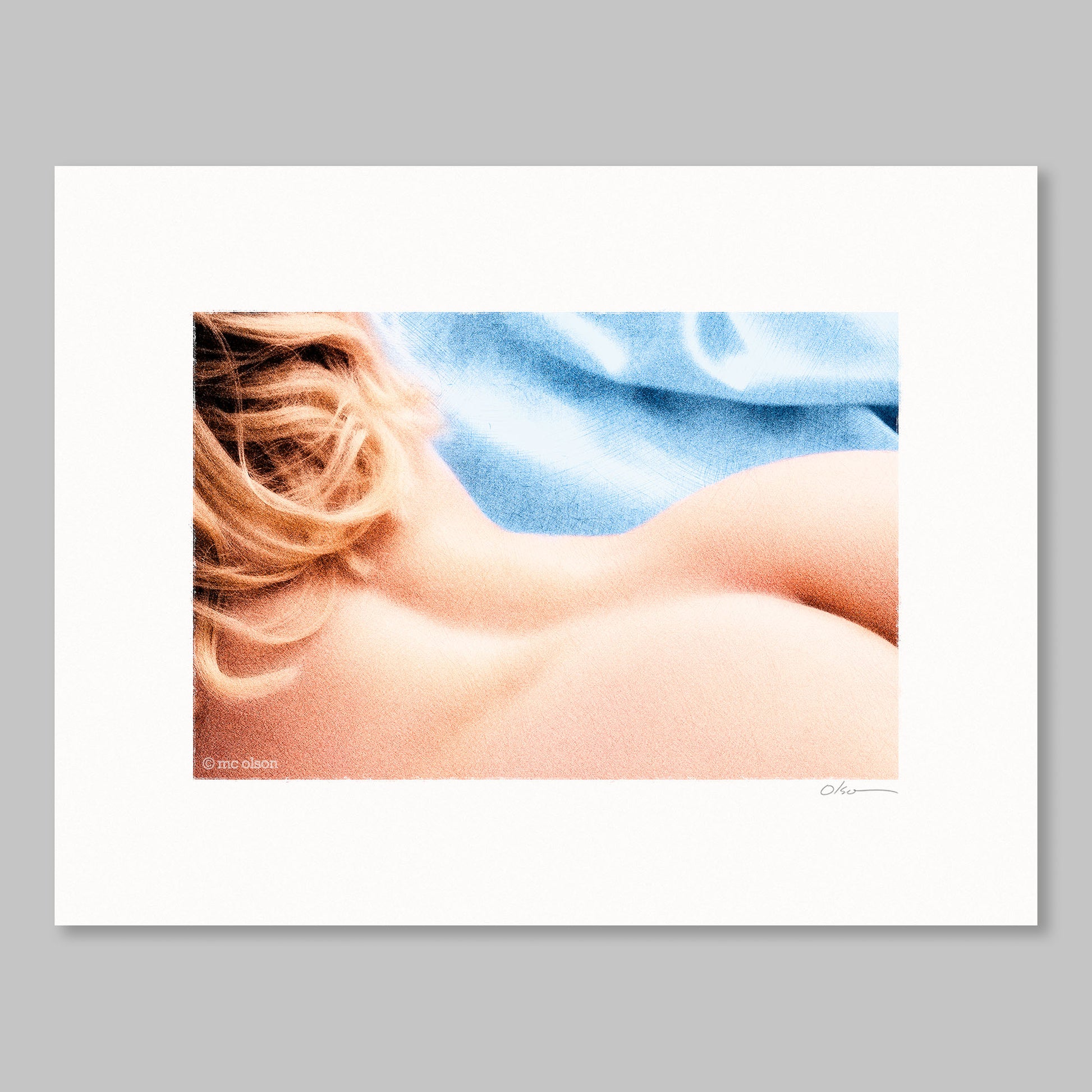 Fine art nude composition with blue background and warm skin tones. This is a detail of a larger composition.