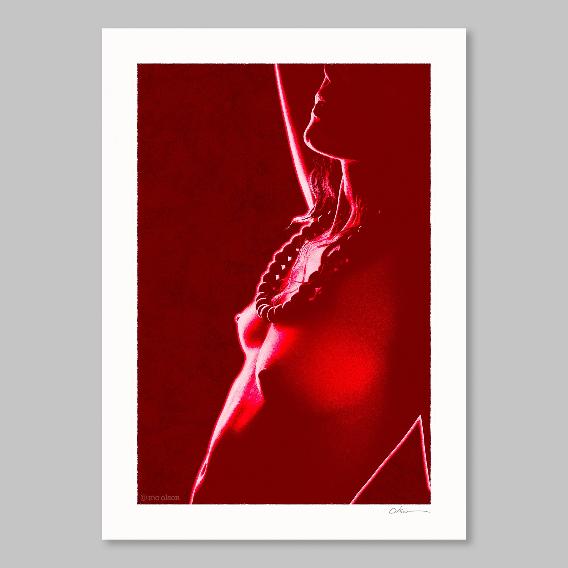 Fine art nude in profile with primitive antique necklace. Boldly and monochromatically red.