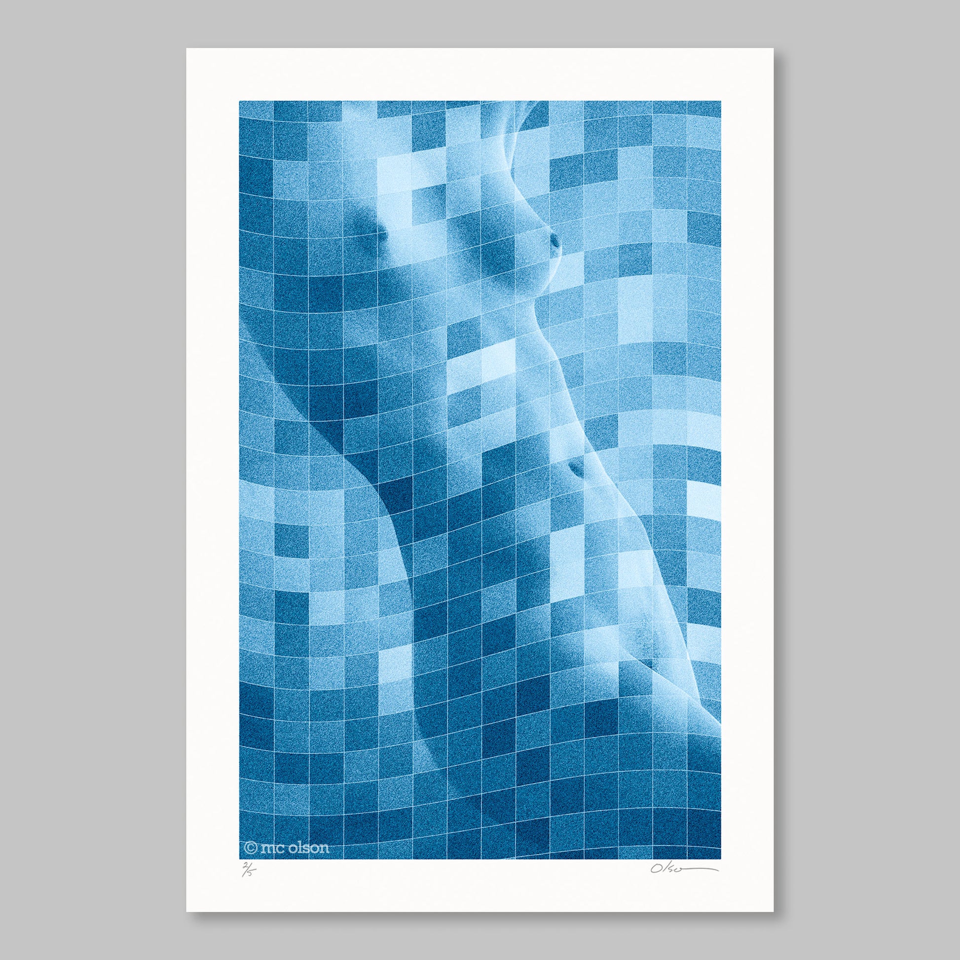A beautiful and svelte pose in diffused natural light. Prominent grain textures. Curvaceous and diagonal elements. A monochromatic print in a bright, cyanish-blue tone.