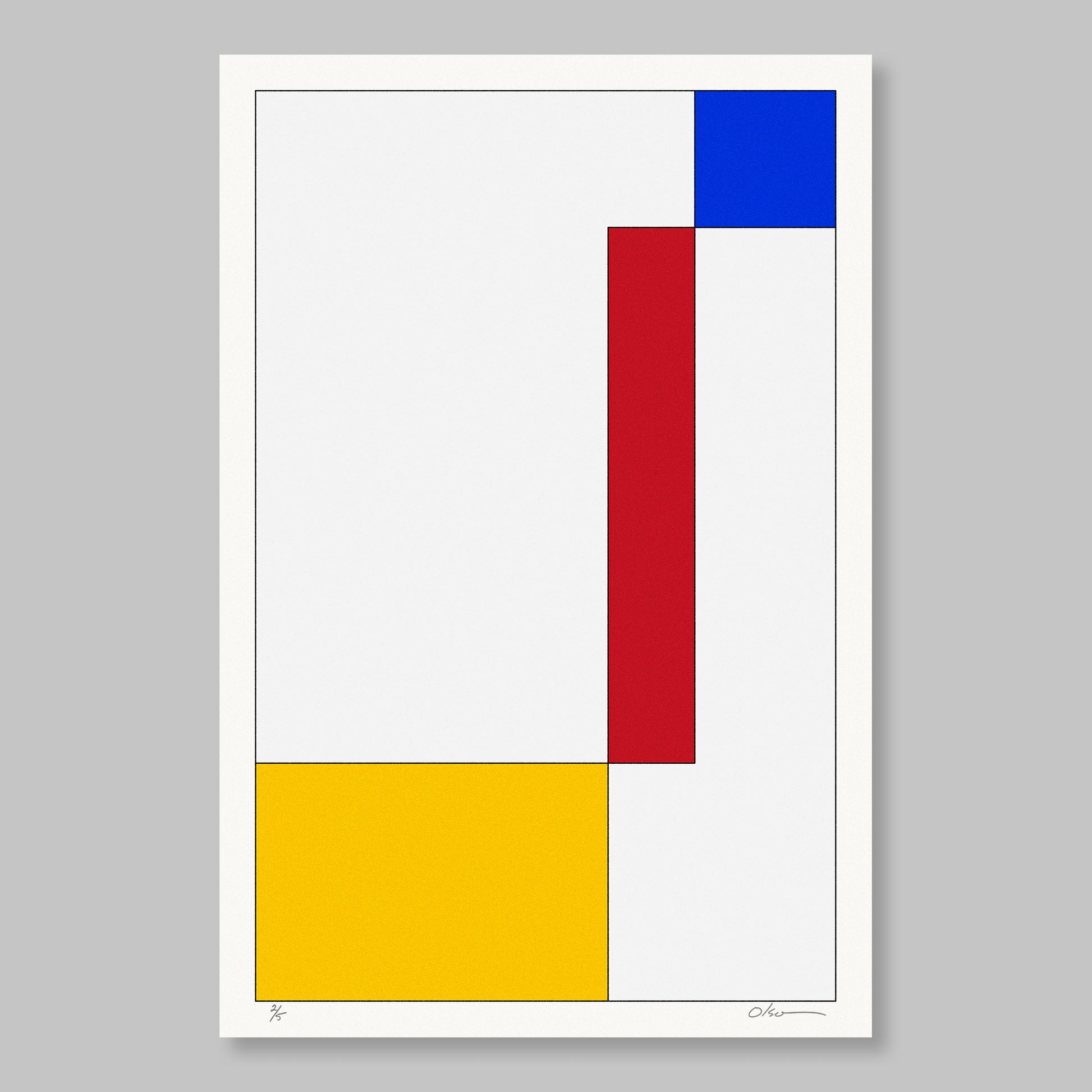 Abstract, non-objective, geometric, neoplastic. Dominant colors: Red, blue, yellow, & very very light gray.