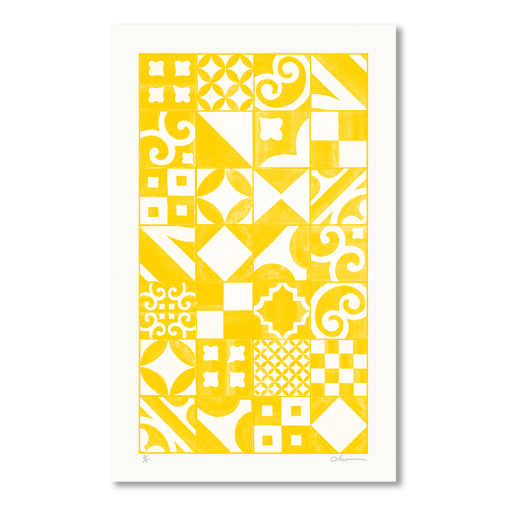 The original section of tiles is black and white. To convert to color, I started working with this in a mode called "Duotone" in Photoshop. Duotone mode actually starts with a grayscale image for luminosity, and the artist can then choose ink colors, from a Pantone pallet, for example. While I liked the woodcut look with two colors of ink (orange and very light gray noise for the whites), test prints looked a little flat for my taste. So, in the end, in the final print, the color is actually comprised of tiny dots of variants, creating slightly more complex, vibrant color.